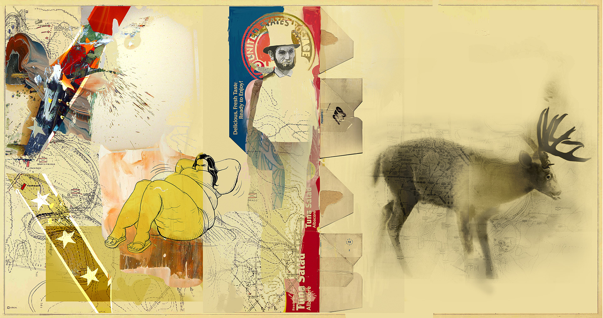 The work can be broken into two parts based on when the image sets changed. The first half features a Stag (protector), the NBA Lincoln (equality), cartoons of BBW exercising (redemption), elements of the Dixie flag (less then) and a 16:1 aspect ratio.