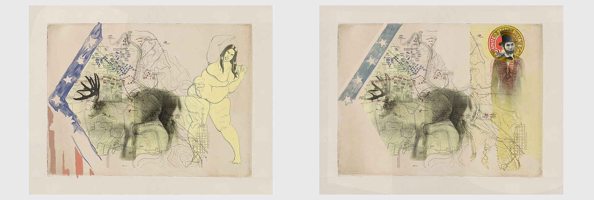Fortunia started its life as a digital dry point (with a 3:4 aspect ratio). The left image (below) original sketch for North vs South. The right side (below) revisited after act one was finished. The Lincoln figure was lifted and placed (unaltered) into piece - since it represented the thrust of act one.