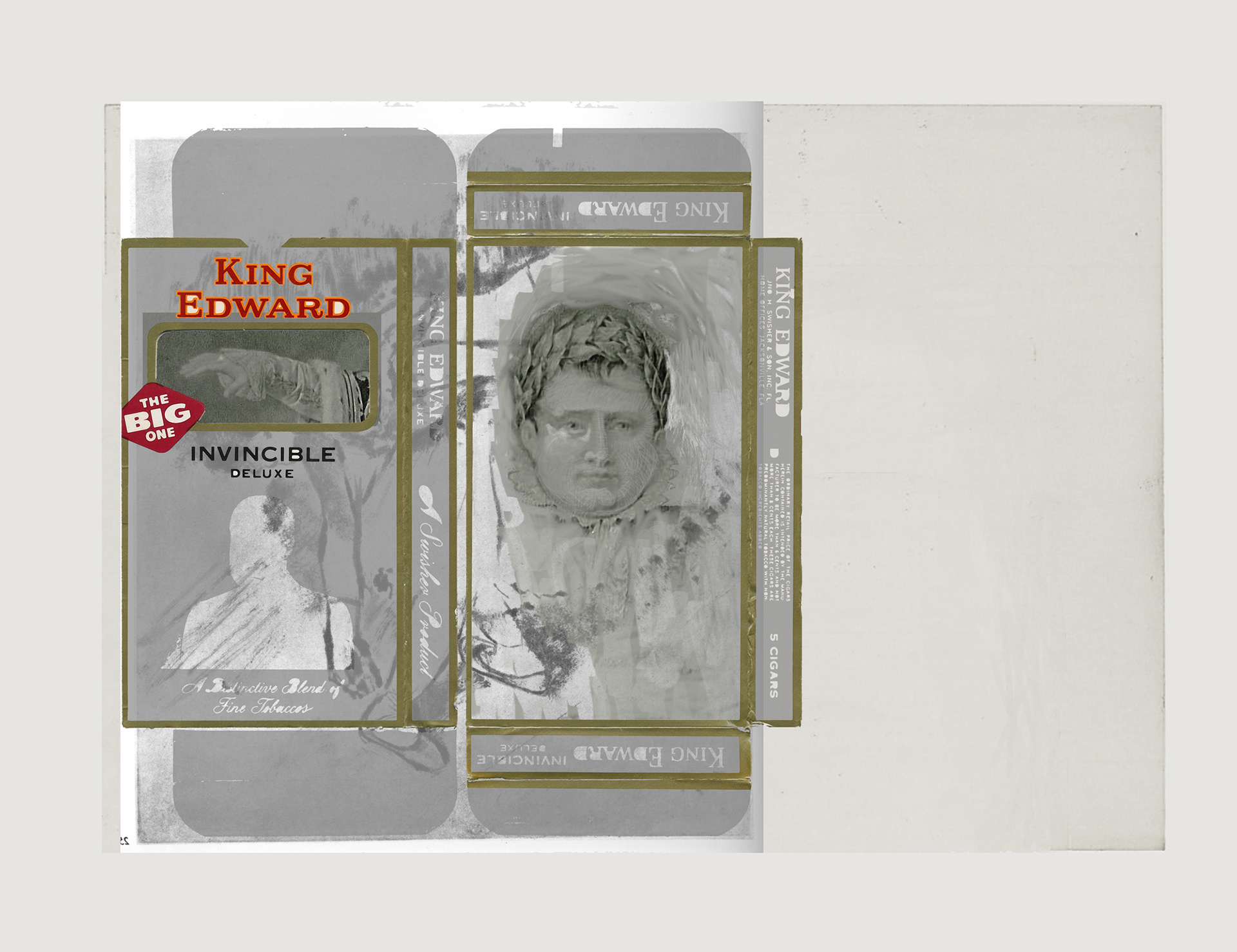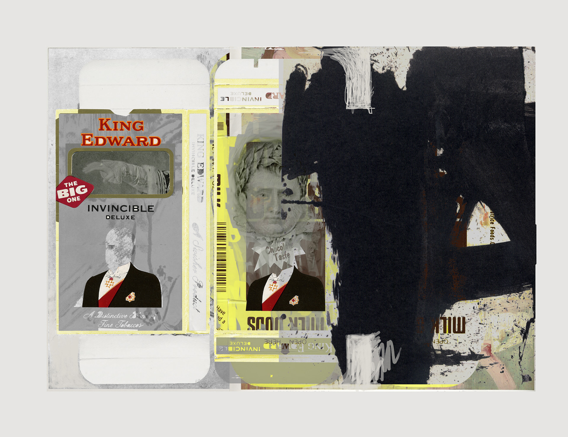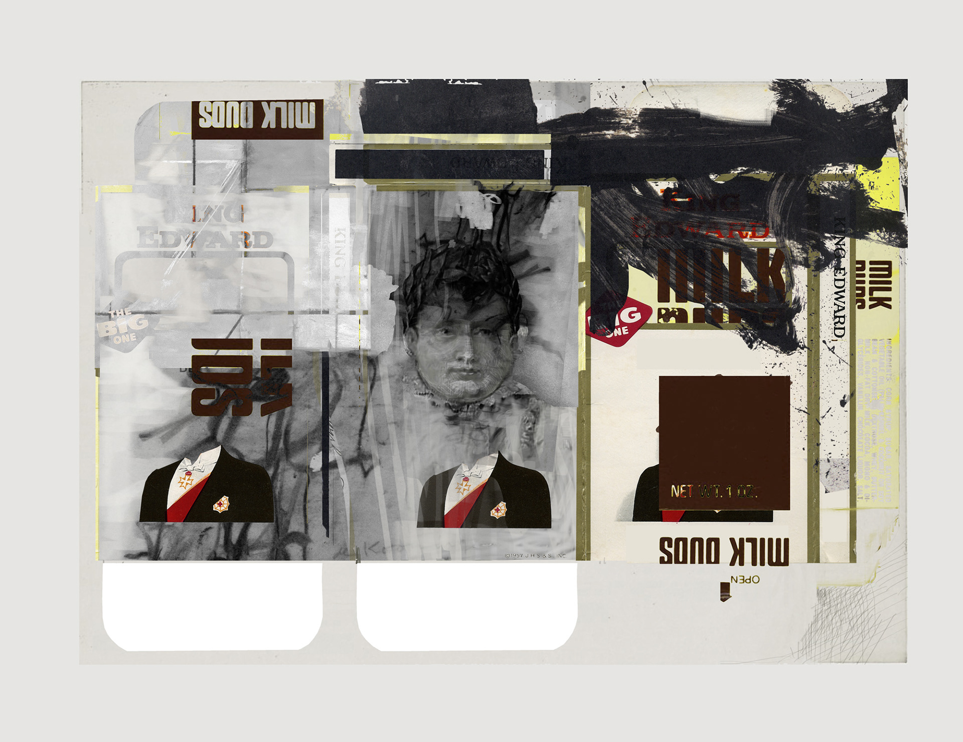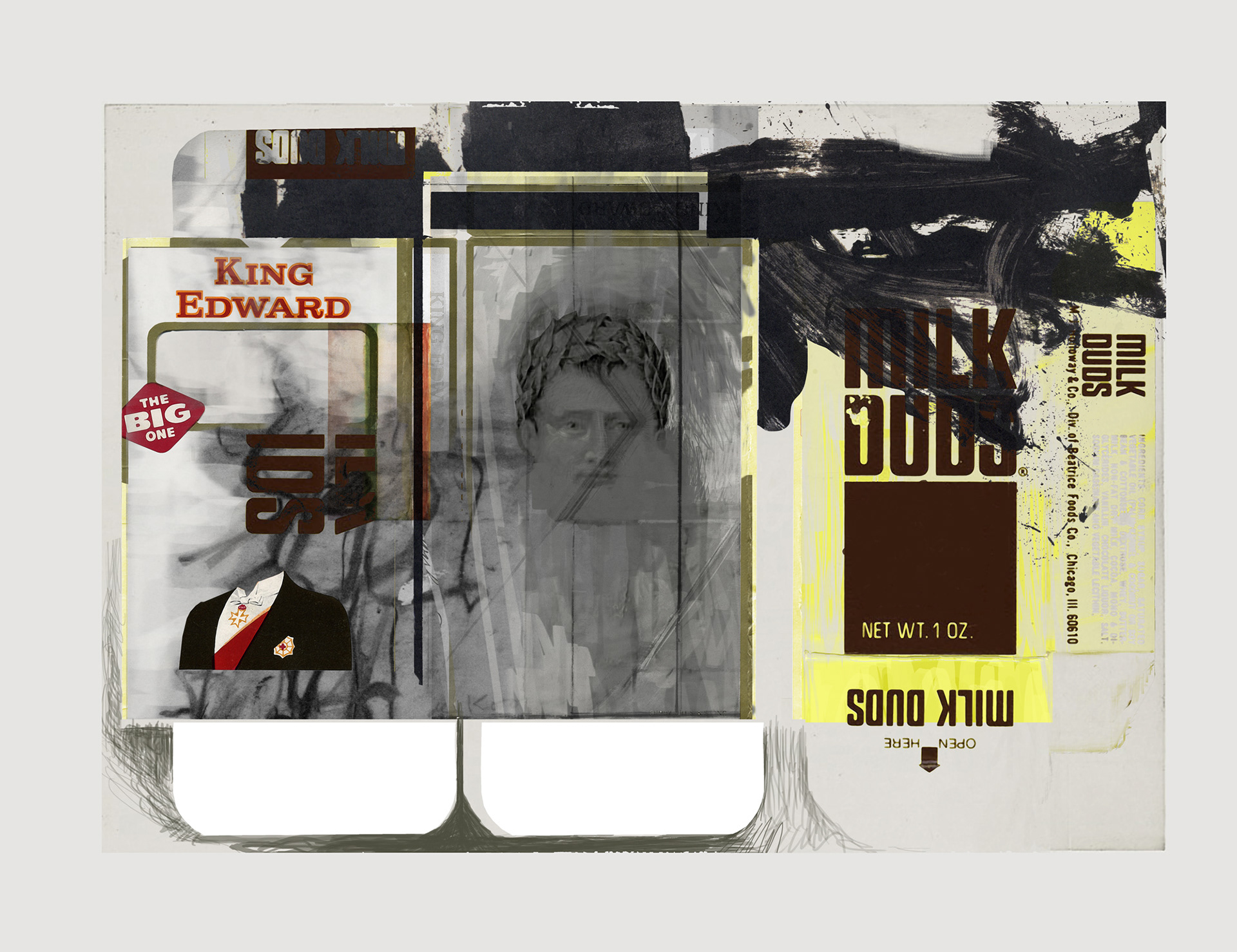 The image set of this piece started with King Edward Cigar (box packaging), Milk Duds (box packaging), an etching of Napoleon (as emperor), with various deKoonings and Debienkorns used as tempo inspirations. Originally the King Edward packaging was used to define two fields creating a diptych. This is a new focus, using box packaging as “skins” or “containers” for the broader visual vocabulary. Over the course of the series, I began to see the top tabs (of the packaging) as headstones. This seemed appropriate considering the historical portraits which were focused on.